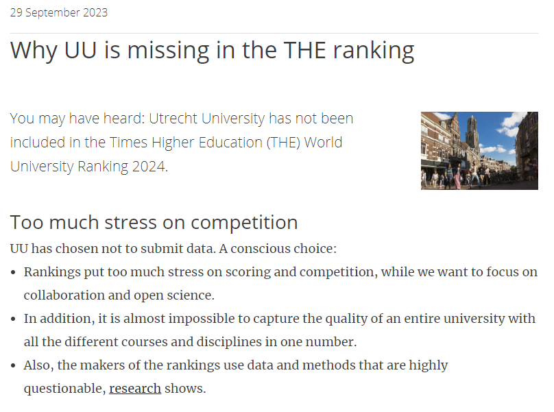 2/16 Our removal from the ranking is a direct effect of not providing data anymore. Only universities that provide data are listed. The main reasons - apart from cost/time investment of providing data - are misalignment the ranking's values with ours: uu.nl/en/organisatio…