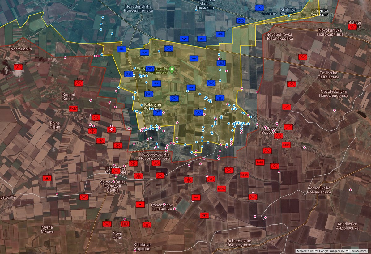 6/55 Russian shelling of Ukrainian positions near the road between Robotyne and Novoprokopivka