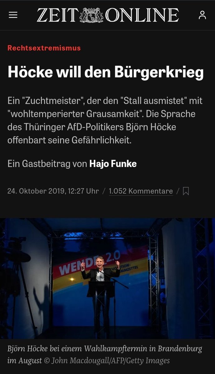 13| Und auch Björn Höcke von der AfD will den Bürgerkrieg. Hier ein Artikel der ZeitOnline von Oktober 2019. zeit.de/politik/deutsc…