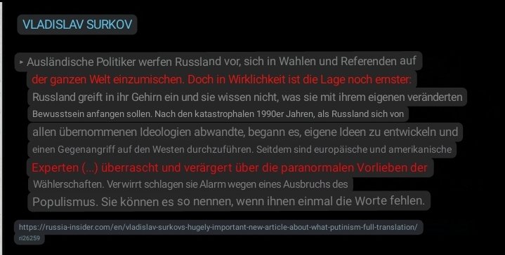 14| Neben Dugin gibt es da noch Vladislav Surkov, der eine eigene Strategie hat, die Wahrheit zu zerstören. Er kommt aus dem Avantgarde-Theater und neigt dazu, zu schreiben was er tut. Seine Stratgie ist perfide und zeigt das ganze Ausmaß des hybriden Kriegs gegen den Westen. S
