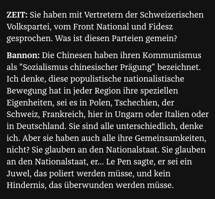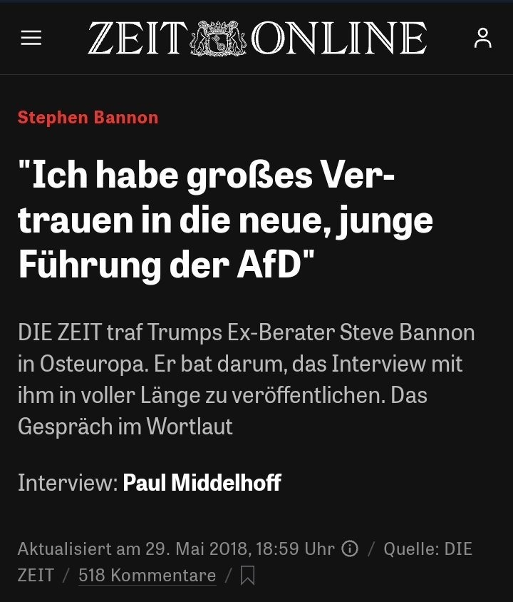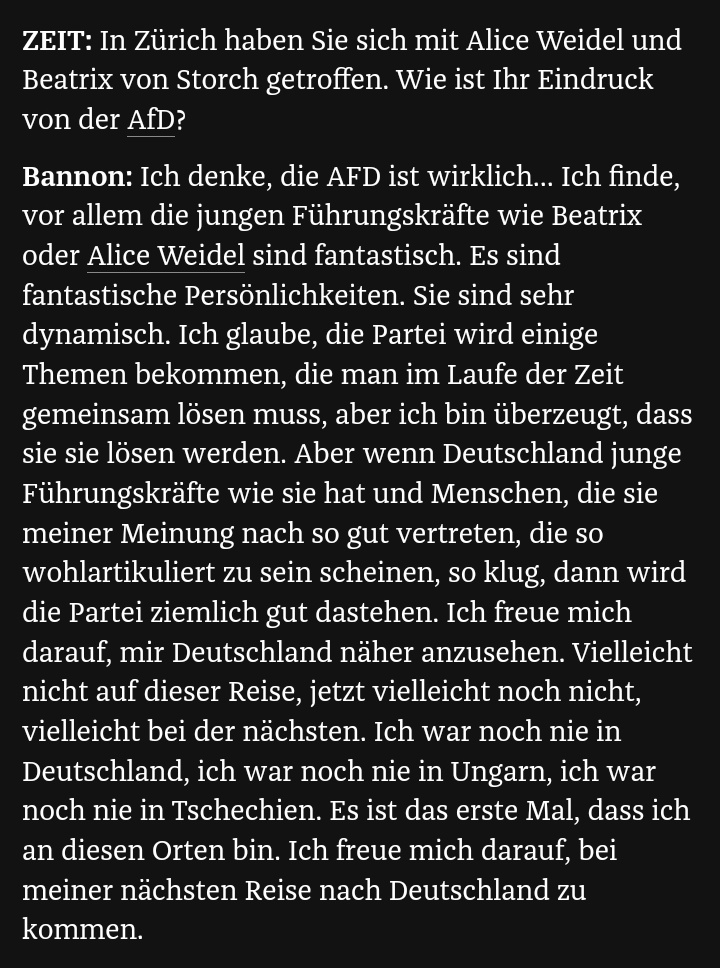 20|Steve Bannon: "Ich habe großes Vertrauen in die neue, junge Führung der AfD". DIE ZEIT traf Trumps Ex-Berater Steve Bannon in Osteuropa. Er bat darum, das Interview mit ihm in voller Länge zu veröffentlichen. Das Gespräch im Wortlaut: zeit.de/politik/auslan…