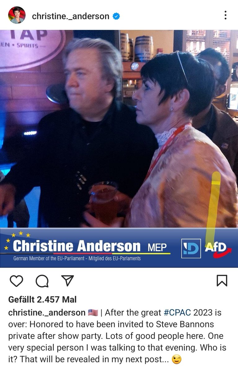 23| Und auch Christine Anderson ist Fan von Bannon und traf sich erst 2023 wieder mit ihm bei der CPAC. So klingt Frau Anderson vom rechten Flügel der AfD im Europaparlament. Populismus gepaart mit Dugins Narrativen. Hier läuft alles zusammen.
