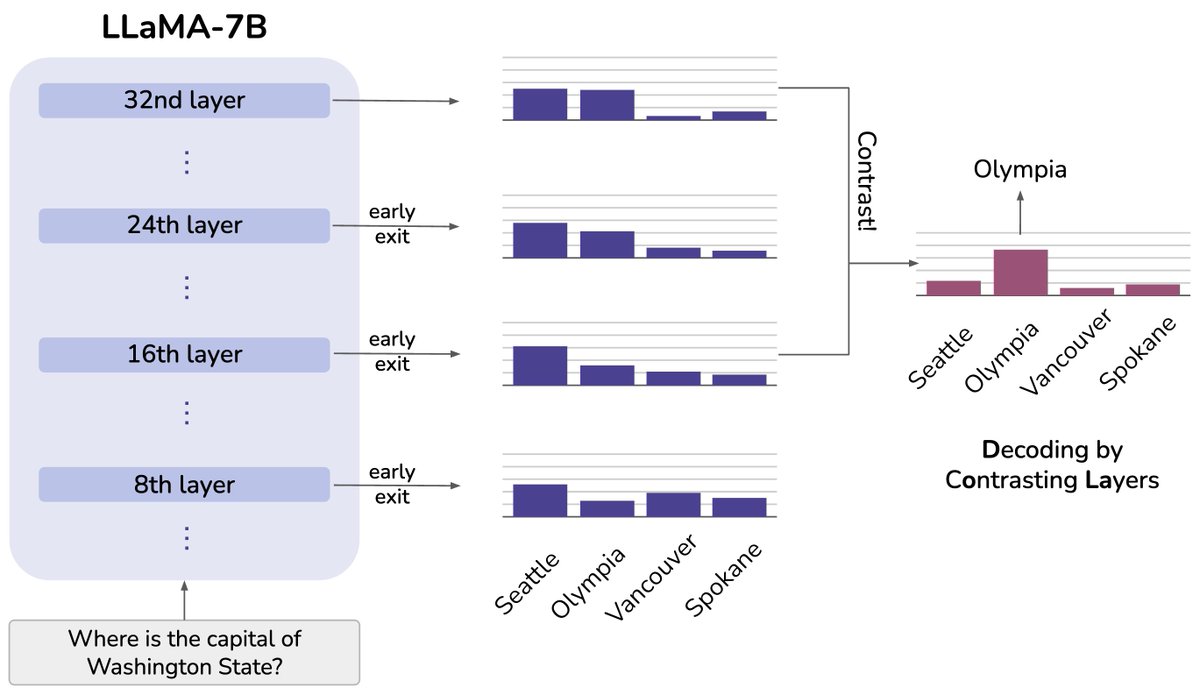DoLa works by contrasting the knowledge differences between the model's own layers. It amplifies factual signals from later layers while filtering out syntactically plausible but incorrect predictions coming from earlier layers. This simple but clever approach steers the model's next-word predictions towards factual responses.