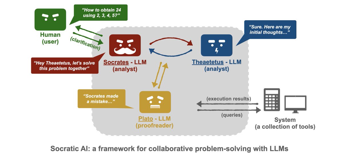 - One LLM plays the role of Socrates, skillfully asking guiding questions to lead the others towards valid solutions and insights.