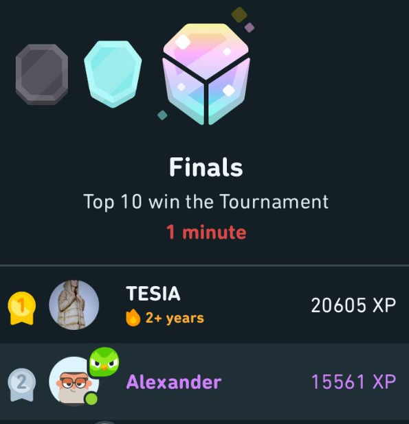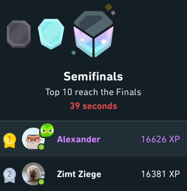 Я добрался до финала рейтинга Duolingo и занял там второе место (первые три считаются победой).