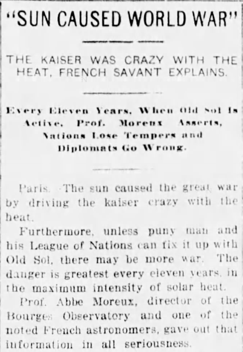 The sun "SUN CAUSED WORLD WAR"  THE KAISER WAS CRAZY WITH THE HEAT, FRENCH SAVANT EXPLAINS  Every Eleven Years, When Old Sol Is Active, Prof. Moreux Asserts, Nations Lose Tempers and Diplomats Go Wrong  Paris. The sun caused the great war by driving the kaiser crazy with the heat.  Furthermore, unless puny man and his League of Nations can fix it up with Old Sol, there may be more war. The danger is greatest every eleven years in the maximum intensity of solar heat.  Prof. Abbe Moreux, director of the Bourges Observatory, and one of the noted French astronomers gave out that information i...