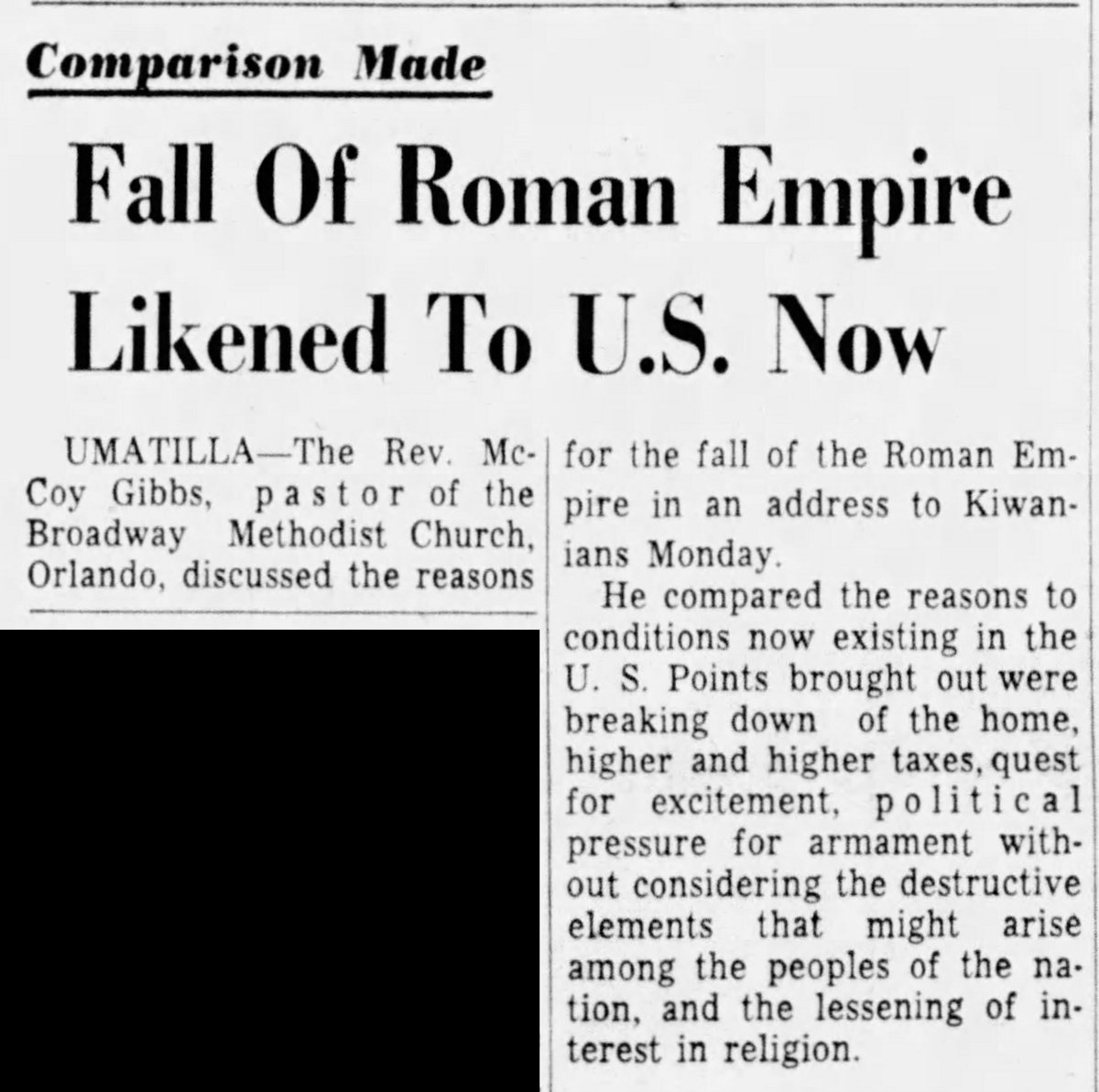 1956 Comparison Made  Fall of Roman Empire Likened To U.S. Now  UMATILLA -- The Rev. McCoy Gibbs, pastor of the Broadway Methodist Church, Orlando, discussed the reasons for the fall of the Roman Empire in an address to Kiwanians Monday.  He compared the reasons to conditions now existing in the U.S. Points brought out were breaking down of the home, higher and higher taxes, quest for excitement, political pressure for armament without considering the destructive elements that might arise among the peoples of the nation, and the lessening of interest in religion.  --The Orlando Sentinel, 6 Decem...