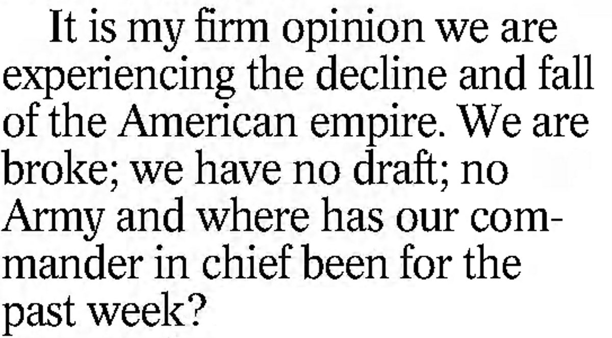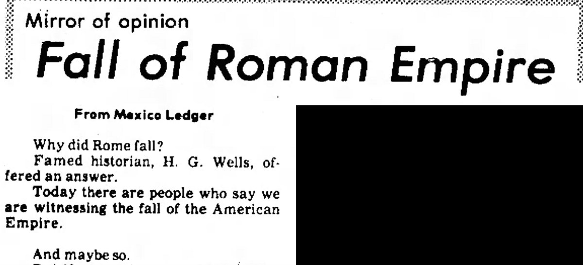 1972 Mirror of opinion Fall of Roman Empire  From Mexico Ledger  Why did Rome fall? Famed historian, H.G. Wells, offered an answer. Today there are people who say we are witnessing the fall of the American Empire.  And maybe so. --The Daily Capital News, 1 August 1972