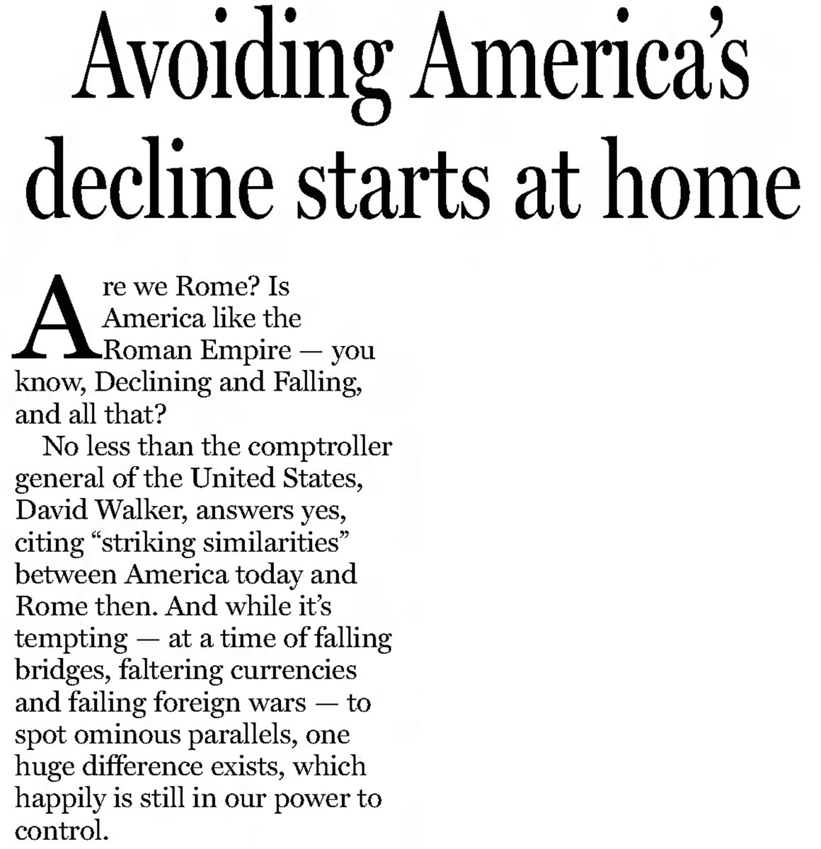 2007 Avoiding America's decline starts at home  Are we Rome? Is America like the Roman Empire -- you know, Declining and Falling, and all that?  No less than the comptroller general of the United States, David Walker, answers yes, citing "striking similarities" between America today and Romen then. And while it's tempting -- at a time of falling bridges, faltering currencies and failing foreign wars -- to spot ominous parallels, one huge difference exists, which happily is still in our power to control.  --West Hawaii Today, 27 August 2007