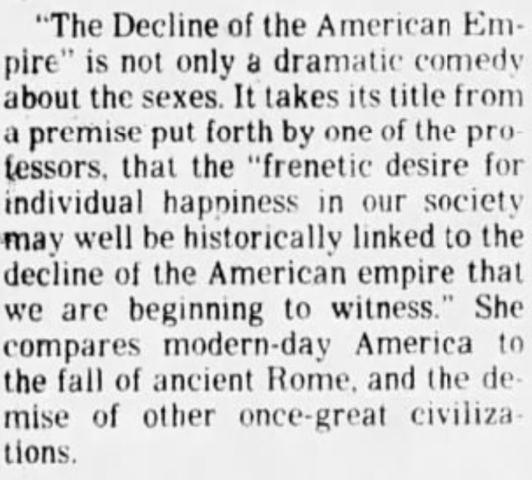 1987 "The Decline of the American Empire" is not only a dramatic comedy about the sexes. It takes its title from a premise put forth by one of the professors, that the "frenetic desire for individual happiness in our society may well be historically linked to the decline of the American empire that we are beginning to witness." She compares modern-day America to the fall of ancient Rome, and the demise of other once-great civilizations.  --The Salt Lake Tribune, 30 January 1987