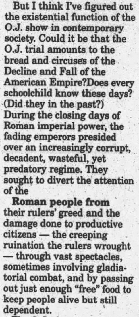 1995 But I think I've figured out the existential function of the O.J. show in contemporary society. Could it be that the O.J. trial amounts to the bread and circuses of the Decline and Fall of the American Empire? Does every schoolchild know these days? (Did they in the past?) During the closing days of Roman imperial power, the fading emperors presided over an increasingly corrupt, decadent, wasteful, yet predatory regime. They sought to divert the attention of the Roman people from their rulers' greed and the damage done to productive citizens -- the creeping ruination the rulers wrought -- t...