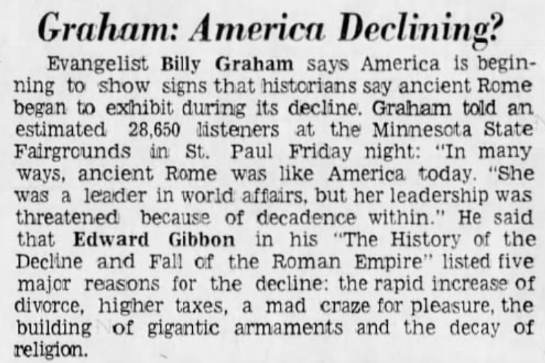 1973 Graham: America Declining?  Evangelist Billy Graham says America is beginning to show signs that historians say ancient Rome began to exhibit during its decline. Graham told an estimated 28,650 listeners at the Minnesota State Fairgrounds in St. Paul Friday night: "In many ways, ancient Rome was like America today. "She was a leader in world affairs, but her leadership was threatened because of decadence within." He said that Edward Gibbon in his "The History of the Decline and Fall of the Roman Empire" listed give major reasons for the decline: the rapid increase o...