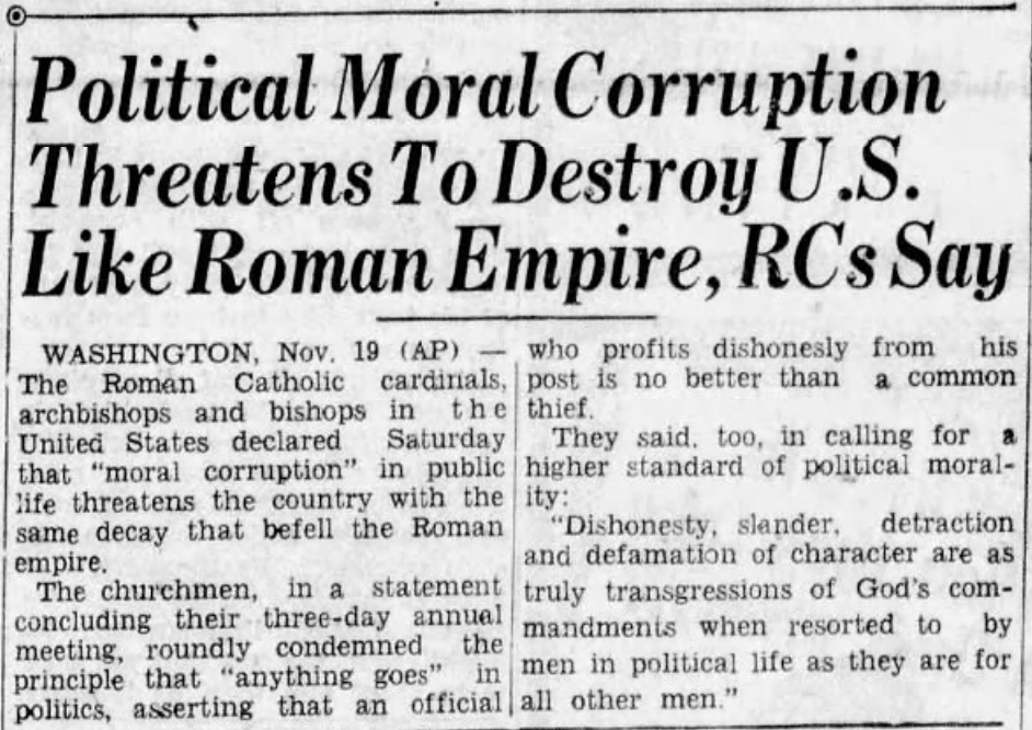 1951 Political Moral Corruption Threatens To Destroy U.S. Like Roman Empire, RCs Say  WASHINGTON -- The Roman Catholic cardinals, archbishops and bishops in the United States declared Saturday that "moral corruption" in public like threatens the country with the same decay that befell the Roman empire.  The churchmen, in a statement concluding their three-day annual meeting, roundly condemned the principle that "anything goes" in politics, asserting that an official who profits dishonesty from his post is not better than a common thief.  They said, too, in calling for a highe...
