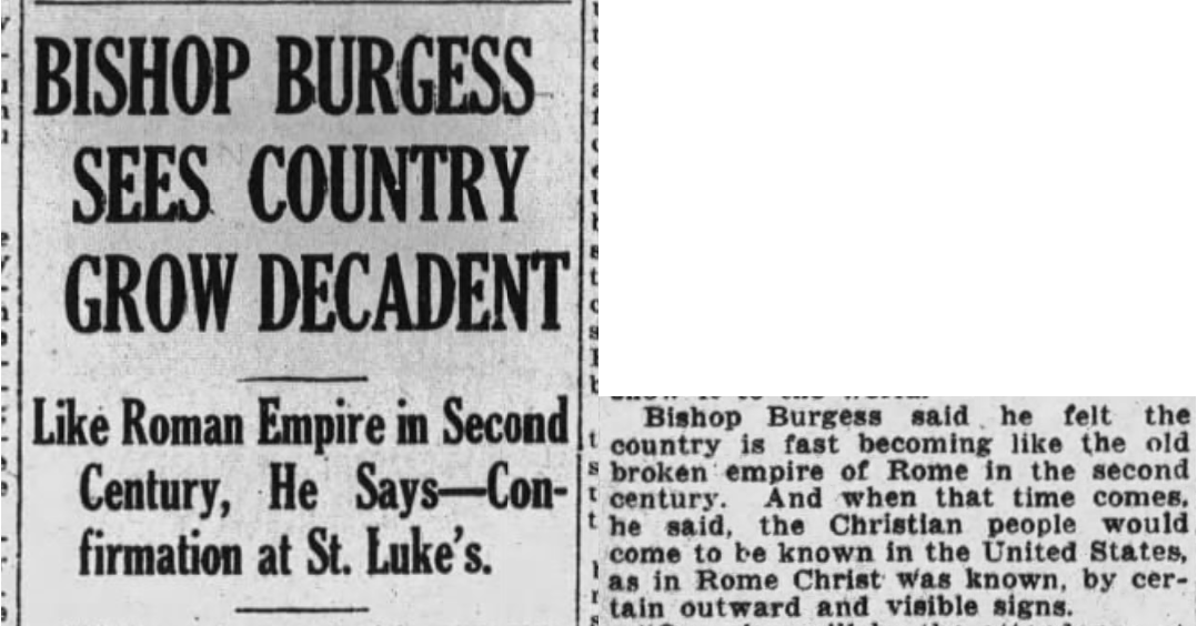 1922 BISHOP BURGESS SEES COUNTRY GROW DECADENT  Like Roman Empire in Second Century, He Says -- Confirmation at St. Luke's  Bishop Burgess said he felt like the country is fast becoming like the old broken empire of Rome in the second century. And when that time comes, he said, the Christian people would come to be known in the United States, as in Rome Christ was known, by certain outward and visible signs.  --Times Union, 3 April 1922