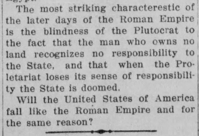 1917 The most striking characteristic of the later days of the Roman Empire is the blindness of the Plutocrat to the fact that the man who owns no land recognizes no responsibility to the State, and that when the Proletariat loses its sense of responsibility the State is doomed.  Will the United States of America fall like the Roman Empire and for the same reason? --Laredo Weekly Times, 30 September 1917