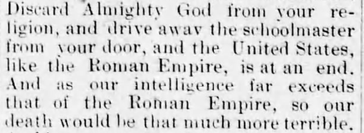 1895 Discard Almighty God from your religion, and drive away the schoolmaster from your door, and the United States, like the Roman Empire, is at an end. And as our intelligence far exceeds that of the Roman Empire, so our death would be that much more terrible. --The Peninsula Times Tribune, 12 July 1895