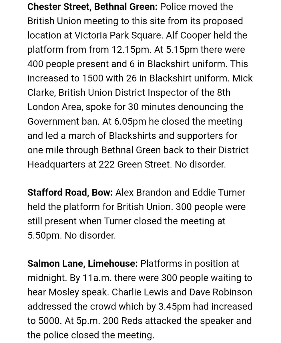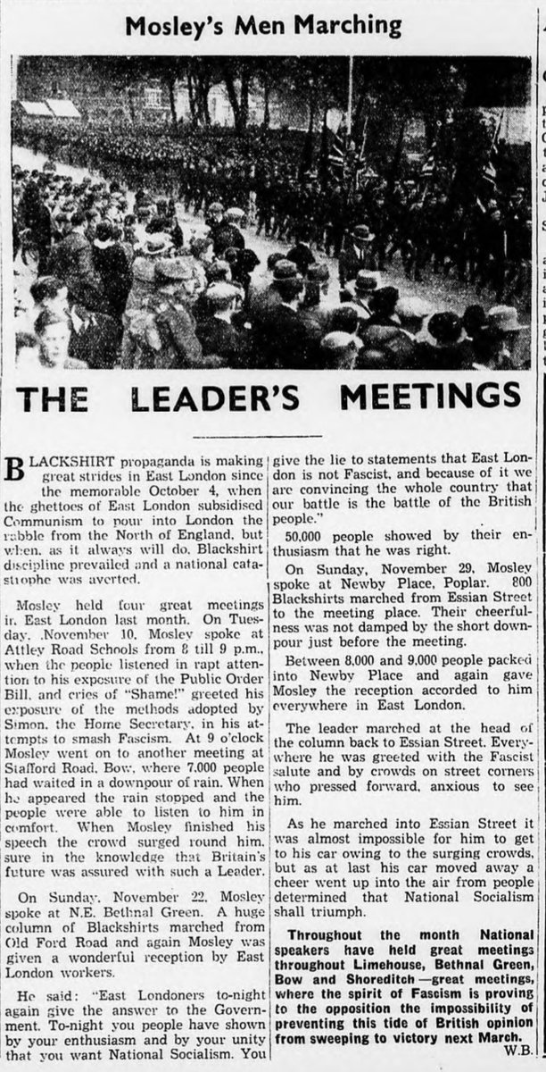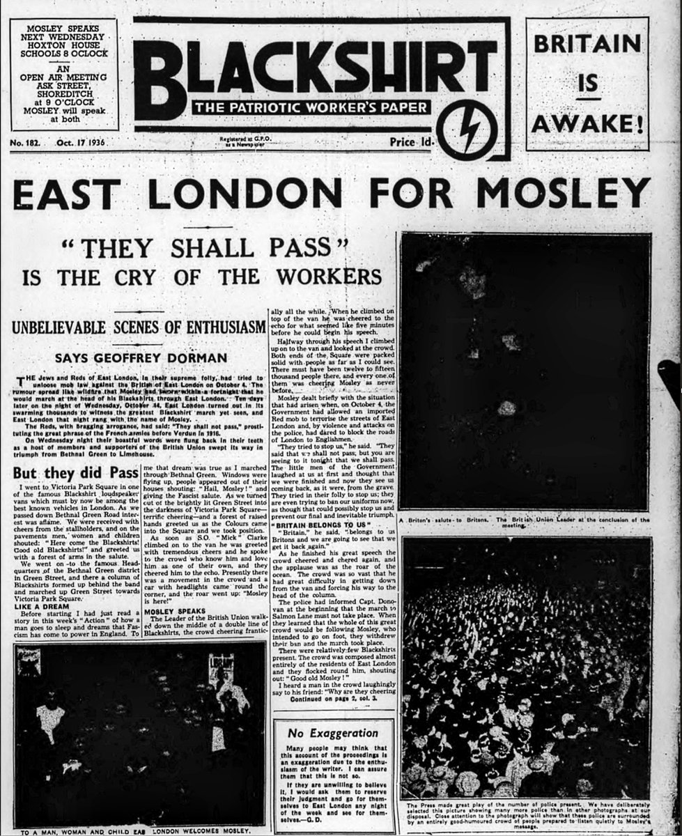 another primary source in the form of Blackshirt newspaper celebrates and documents Mosley's return to East London ten days after the battle of Cable Street