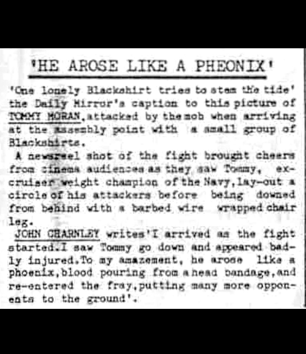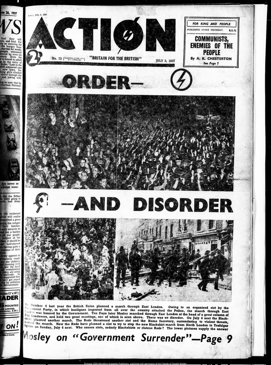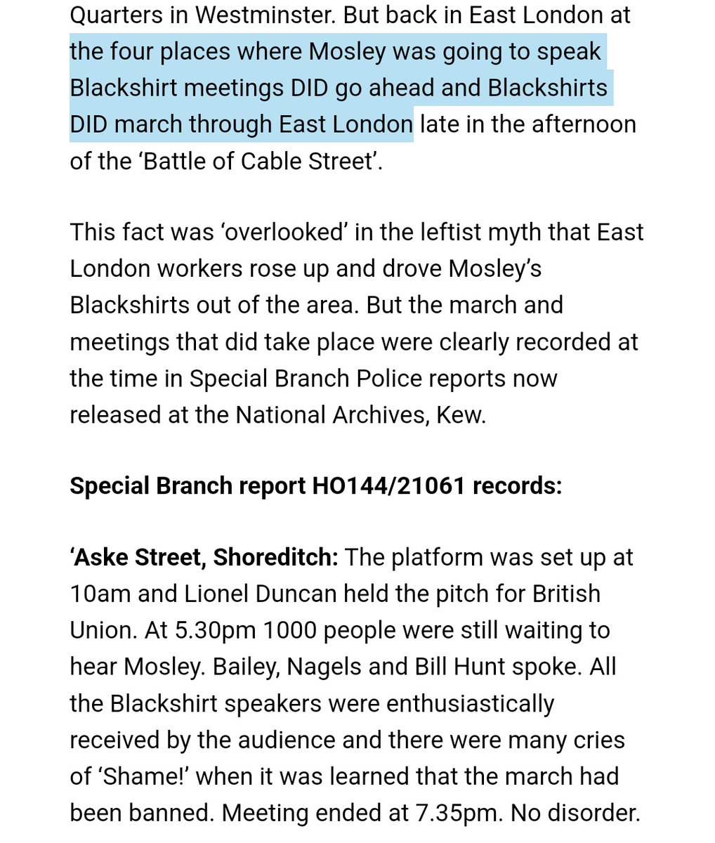 another primary source in the form of Blackshirt newspaper celebrates and documents Mosley's return to East London ten days after the battle of Cable Street