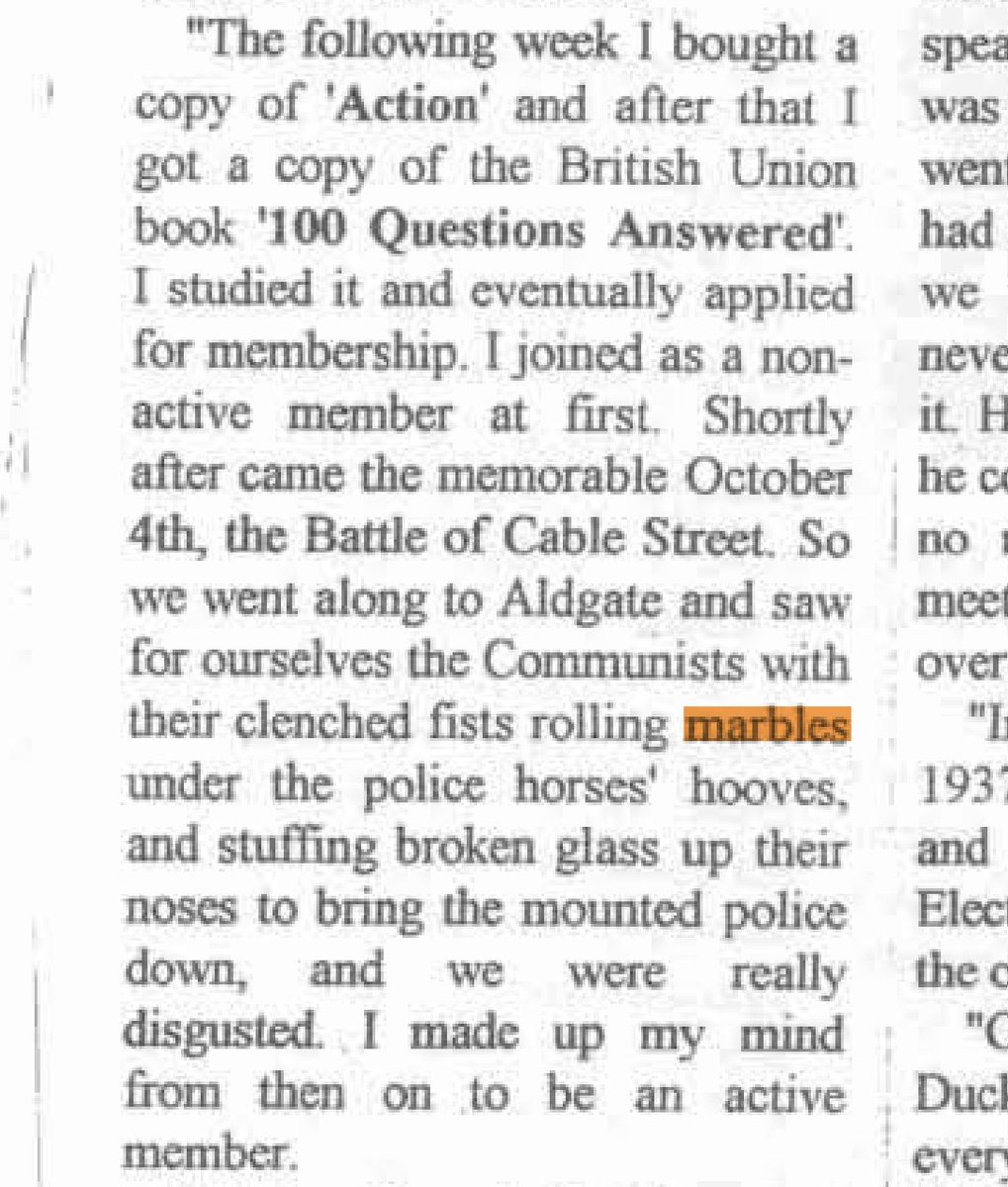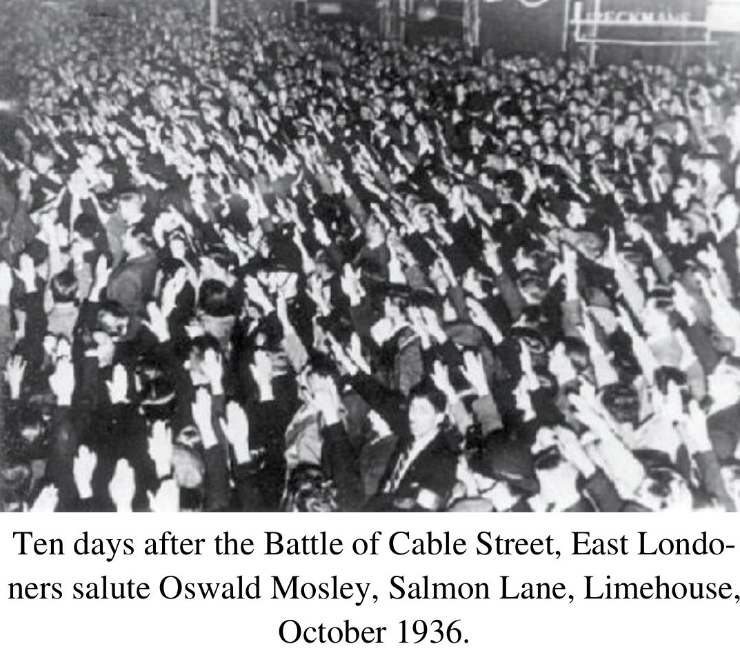 one last bonus point is that the communists tried a victory parade the Sunday after the battle of Cable Street and were pelted with fruit and flour