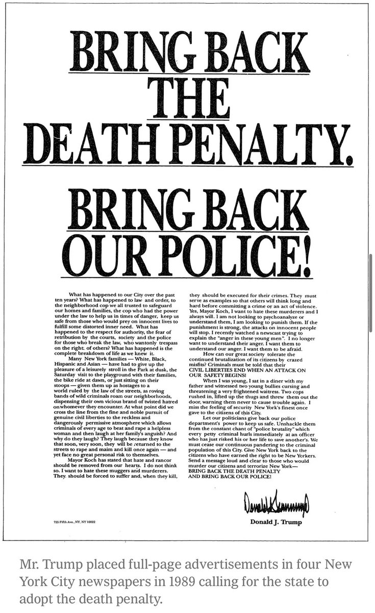 —A virulent racist who was sued by Nixon’s DOJ for refusing to rent condos to black people and took out full page ads in the @nytimes calling for the execution of the (now exonerated) “Central Park 5” (a decision he proudly says he stands by even after they were found innocent)