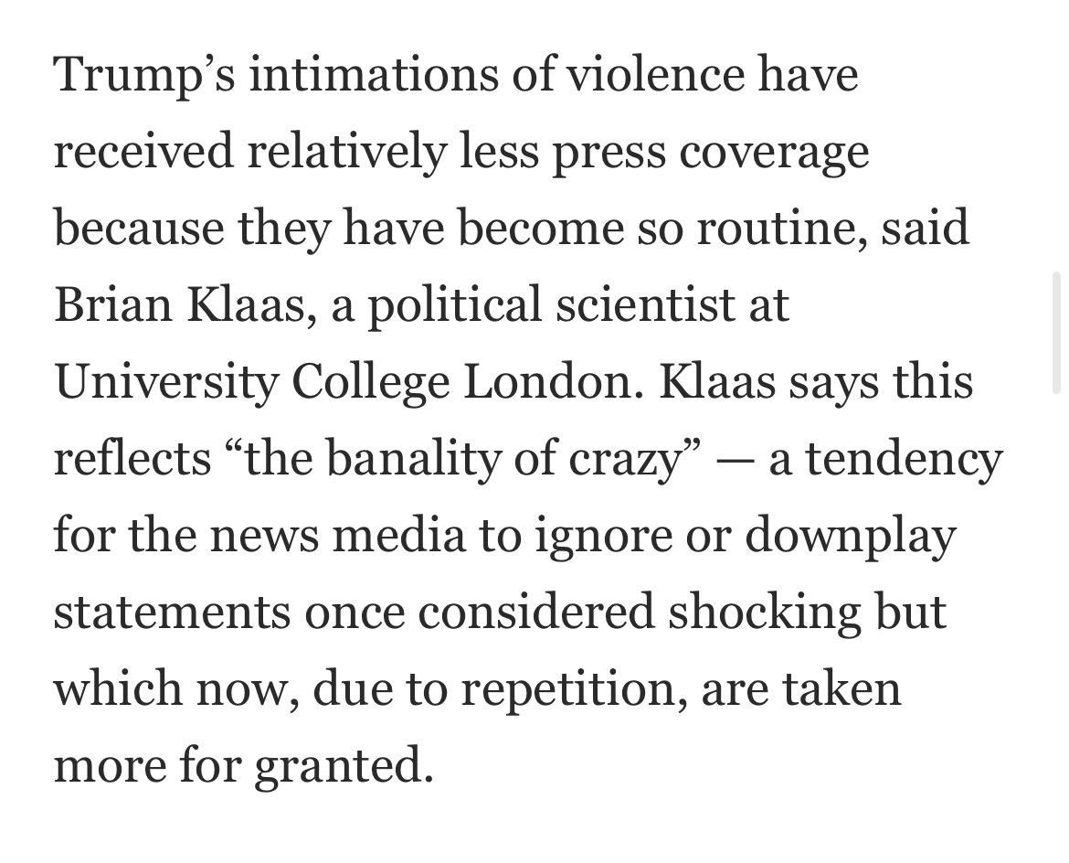 Trump’s violent rhetoric is getting muted coverage by the news media. After eight years of Trump in politics, is a ‘banality of crazy’ setting in? (*cough* YES *cough*).