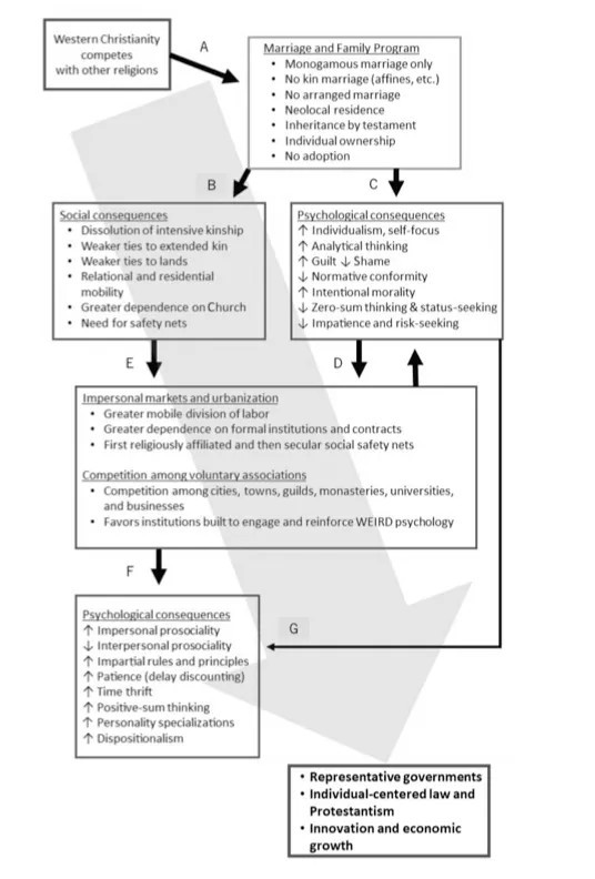 l'interdiction progressive par l'Eglise du mariage entre degrés de parenté de plus en plus éloignés a sorti les Occidentaux d'une mentalité clanique, permettant l'émergence de sociétés individualistes et dynamiques. Ce qui a permis l'essor de l'Occident.