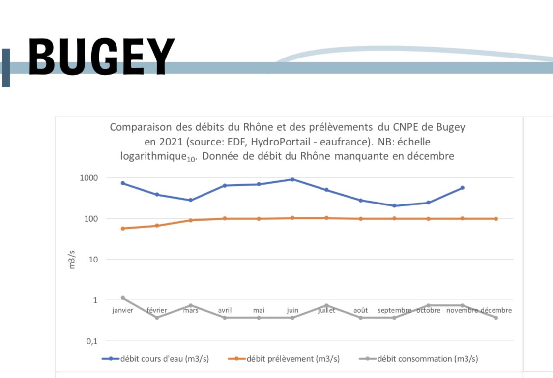 3/n Le prélèvement net (consommation) d’eau de la centrale (prélèvement - rejets) est de l’ordre de 1m3/s. Rapporté au débit du fleuve à la station hydrométrique la plus proche (Lagnieu) cela représente entre 0,1% et 0,3% du débit du Rhône selon les mois.
