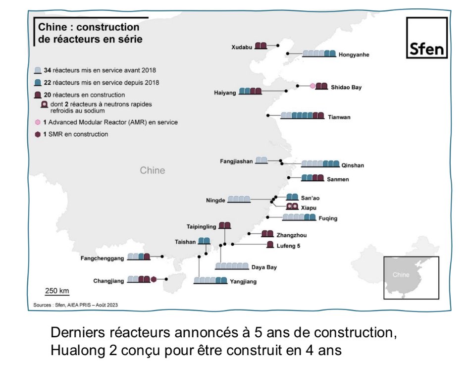 10/n La Chine (carte @SFENorg) est en train de démontrer l’effet de série sur la construction de nouveaux réacteurs nucléaires: 20 réacteurs en construction, 5 ans pour les prochains Hualong, nouveau design Hualong2 pour une construction en 4 ans
