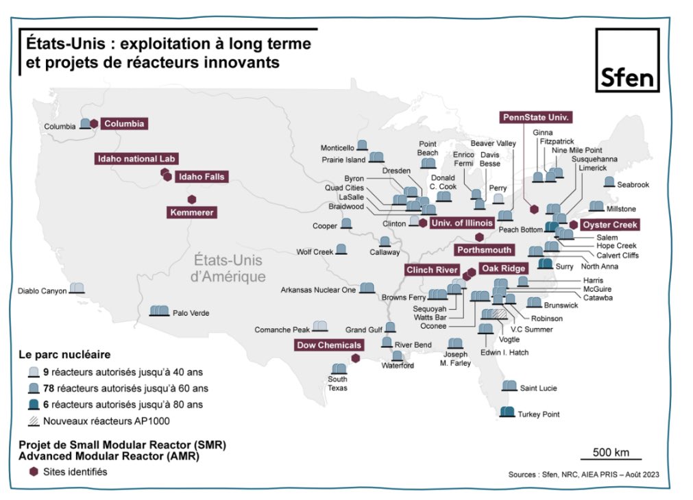 9/n L’exploitation à long terme du parc nucléaire actuel est un composant clef: aux Etats-Unis, 76 réacteurs ont été autorisés à 60 ans et 6 déjà à 80 ans. A noter en rouge (belle carte @SFENorg ) les sites déjà annoncés pour des projets SMR/AMR