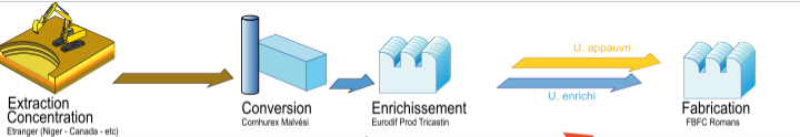 3/n L’uranium n’a qu’un seul propriétaire (l'exploitant nucléaire) à partir de l'achat auprès de la compagnie minière et l'extraction. L'exploitant souscrit ensuite des contrats de services auprès d'autres industriels pour la conversion, l'enrichissement, et la fabrication