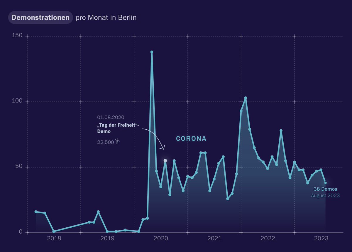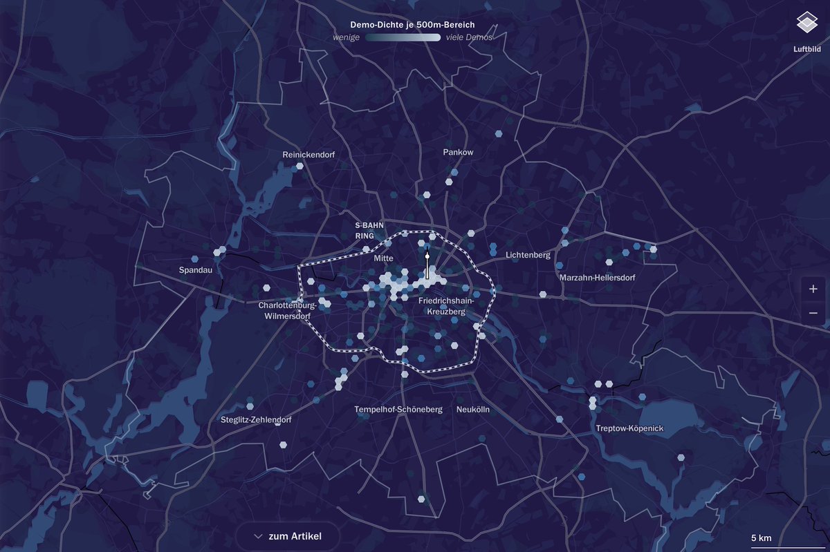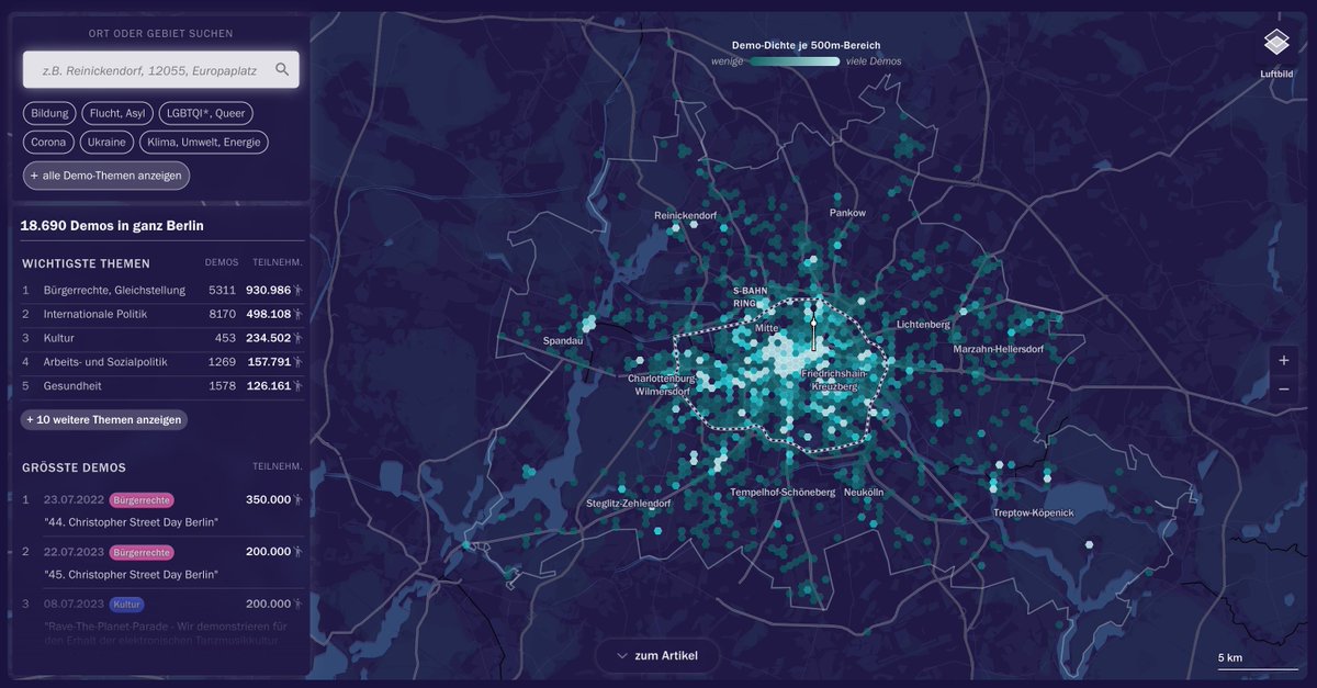 Im Demo-Atlas für Berlin könnt ihr alle Demos der letzten 3 Jahre erkunden: Wofür wurde in meinem Kiez demonstriert? Durch welche Kieze führten die Coronamärsche? Wo gingen @dwenteignen auf die Straße, wo @FridayForFuture? (5/6) #ddj interaktiv.tagesspiegel.de/lab/demo-atlas…