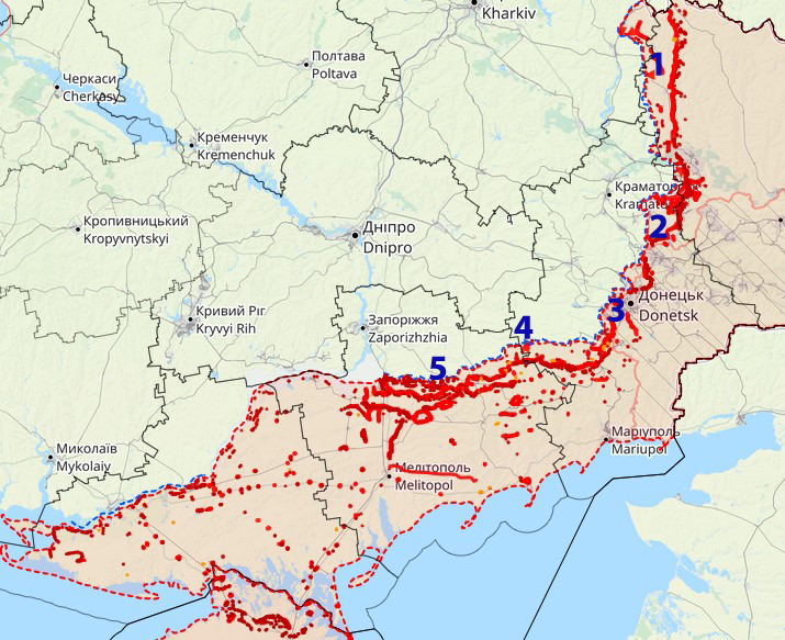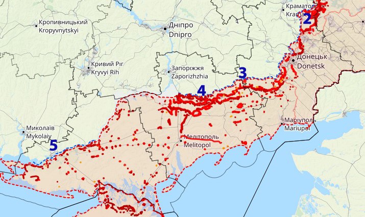 Kämpfe schließen - entweder massive 🇷🇺 Gegenangriffe an mehreren Stellen oder einen 🇺🇦 Durchbruch. Für letzteres gibt es keine Hinweise, die Berichte 🇷🇺 Milblogger deuten auf größere Angriffe an der SO-Front (3) sowie bei Robotine und Werbowe (4) - evtl. wird dort versucht,