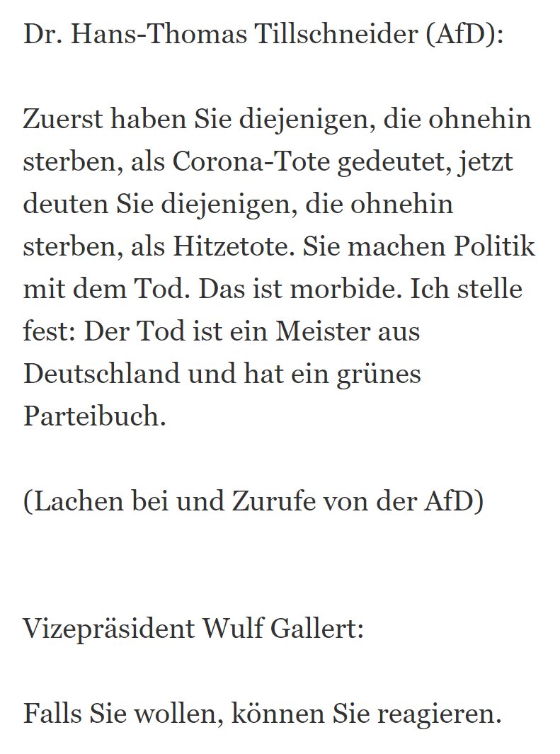 Der Text, um den es laut Plenarprotokoll geht, lautet: "Zuerst haben Sie diejenigen, die ohnehin sterben, als Corona-Tote gedeutet, jetzt deuten Sie diejenigen, die ohnehin sterben, als Hitzetote. Sie machen Politik mit dem Tod. Das ist morbide. Ich