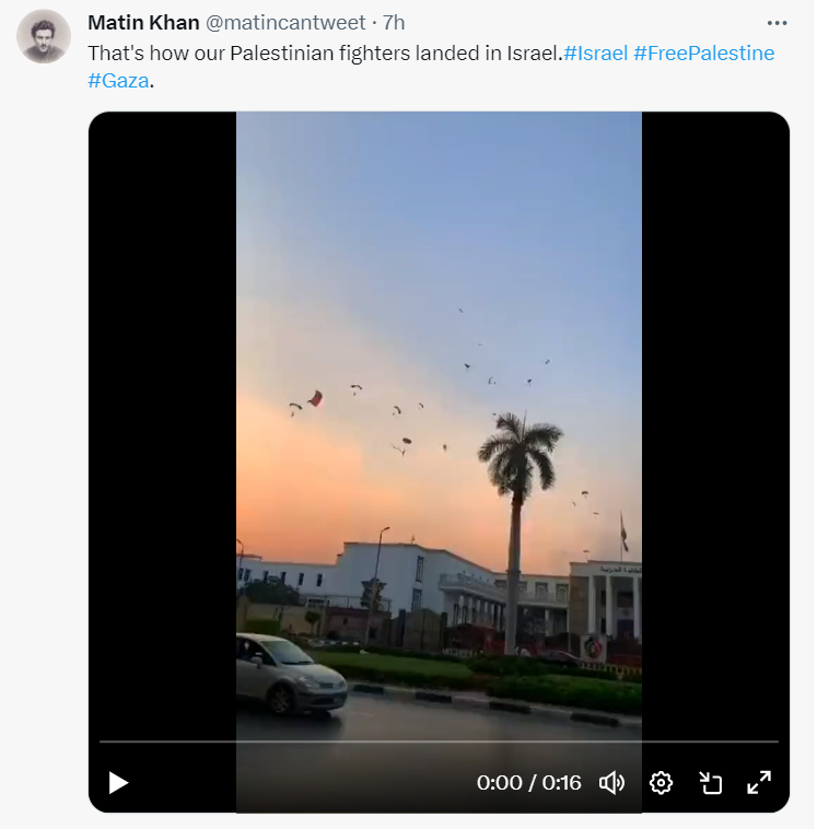 This is not a video of Palestinian fighters landing in Israel. This clip is filmed in Egypt, and the building in the background is a military academy in Cairo.