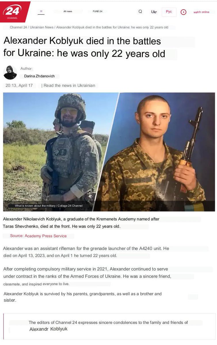 “Alexander Koblyuk, a graduate of the Kremenets Academy named after Taras Shevchenko, died at the front. He was only 22 years old.”
