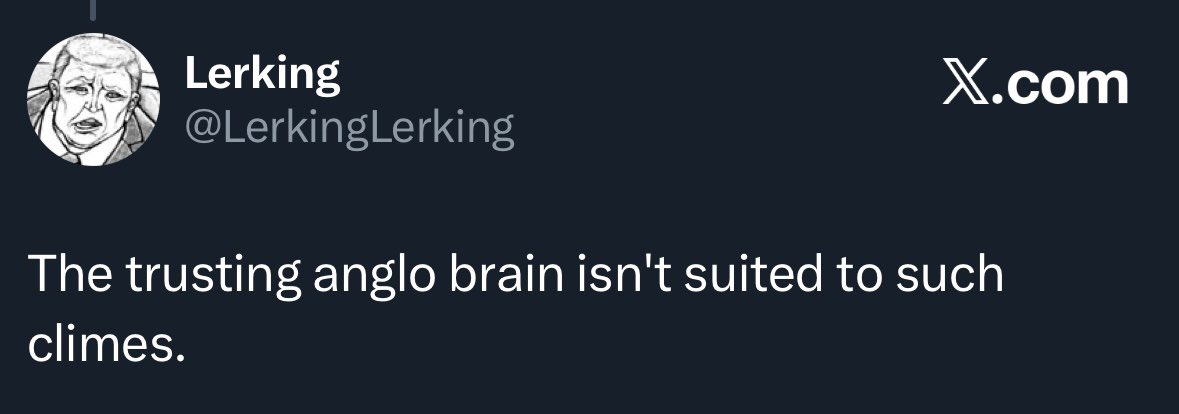 Really this is the Lusotropicalification of you own mental space. Maybe it is just the path of least resistance to embrace the Lusotropicalism, Brazil is after all the best worst country in the world. Imagine how good it could be with a Basically Finest government. You don’t want to go back to Yookayian hollowed-out legacy industriousness culture with Babel-maxxed dystopian clown customs characteristics you could stay in Brazil, being as it is ‘a version’ of the same thing. This is a ‘Bronze Age Pervert’ point - in hyper-Yookay you have these nagging puritan Protestant social mores on top of the dysfunction of Brazil. In Brazil you have the dysfunction of Brazil but you don’t have these nagging puritan Protestant social mores and at least the weather is nice