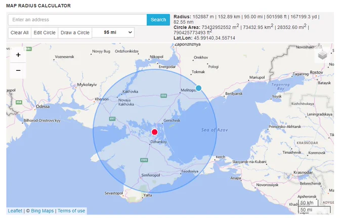 This map is a 150 km radius map of Southern Crimea from the damaged and by-passed Chonhar Bridge just north of Dhzankoy.