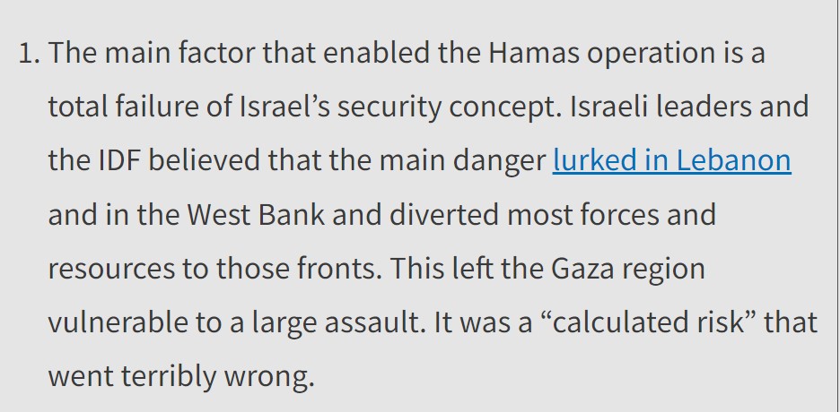 The way such "calculated risks" works in real life is that senior Israeli political and flag rank leaders invested in the threat of Hezbollah in Lebanon refused to hear anything contrary to their "calculated risk consensus" concerning Hamas.