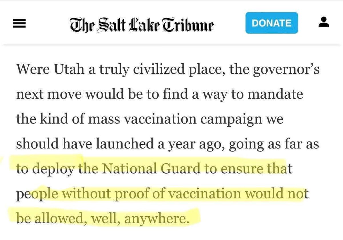 The intolerant often want to use government to silence those who disagree with them. To that end, on occasion they identify an “emergency” that in their view somehow justifies the criminalization of non-criminal conduct — not just any such conduct, but conduct that is commonly engaged in by people who don’t agree with them. The action taken yesterday by the governor of New Mexico is an example of this approach. Another example can be found in The Salt Lake Tribune’s call — issued by its editorial board in 2022 — for Utah’s governor to “deploy the national guard” to impose house arrest on all Utahns “without proof of vaccination.” Through these and countless other examples, we can discern the importance of maintaining a degree of skepticism toward those wanting to restrict liberty on the basis of an “emergency.”