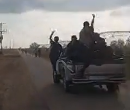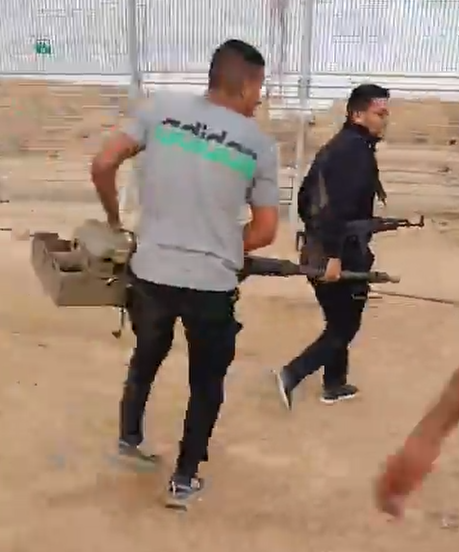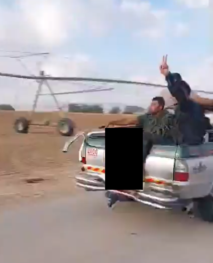 10 minutes later, the Mitsubishi returns from Nir Oz. There is a dead Israeli civilian hanging out of the truck bed. The truck continues towards Gaza.