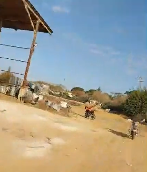 They arrive at Nir Oz a few minutes later, and disembark next to another pair of motorcycles. Shots can be heard from the kibbutz.