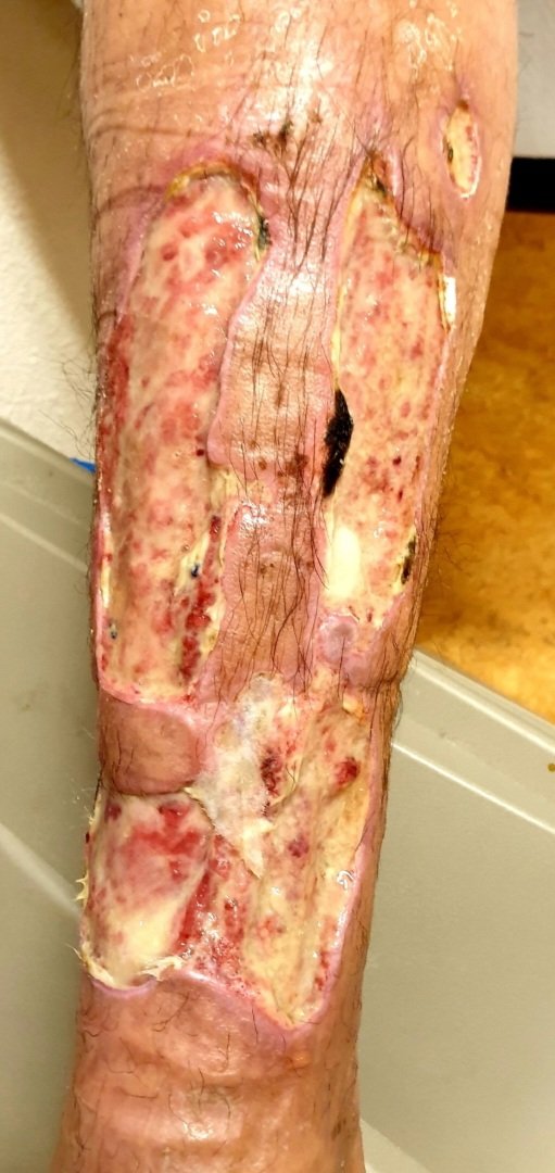 Na boze reacties op mijn bericht van gisteren 'dat zorg echt niet zomaar wordt geweigerd' deel ik graag de beenwond van een patiënt van mij die zo op straat sliep.