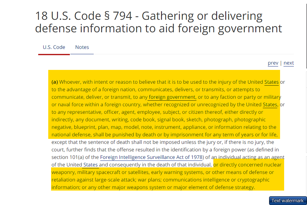 But the Pratt story is a much more serious crime under 18 USC 794 and the elements appear from the reporting to be met because Pratt is a foreign citizen.