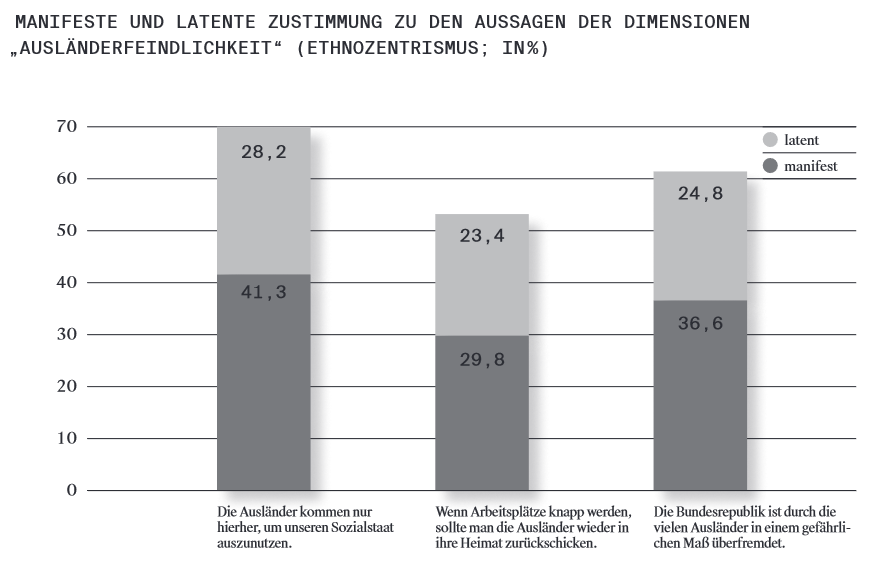 Lediglich 40 % der Ostdeutschen sehen keine (!) Gefahr der “Überfremdung“, gerade mal ein Drittel findet nicht (!), dass „die Ausländer“ nur hierherkommen, um den Sozialstaat „auszunutzen“. Muslimfeindschaft ist insgesamt am weitesten verbreitet. 3/14