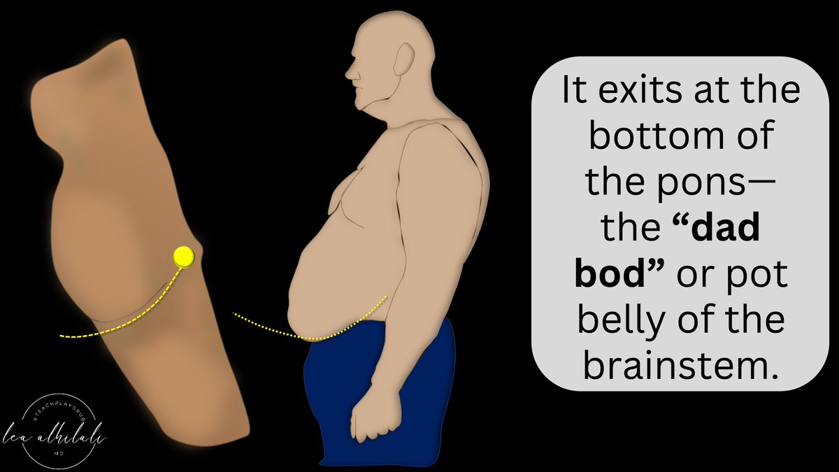 3/It exits the brainstem at the inferior aspect of the pons—under what looks like pot belly of the pons, what I call the “dad bod” of the pons