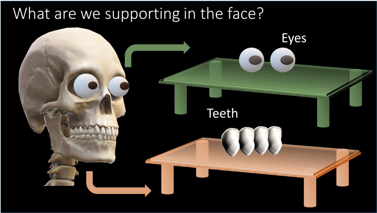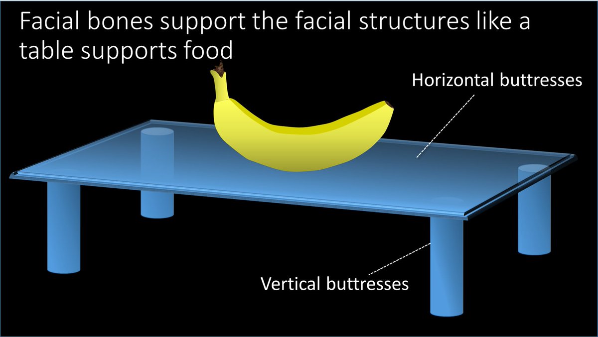 Facial bones support facial structures like a table supports food, with legs (vertical buttresses) and table top (horizontal)