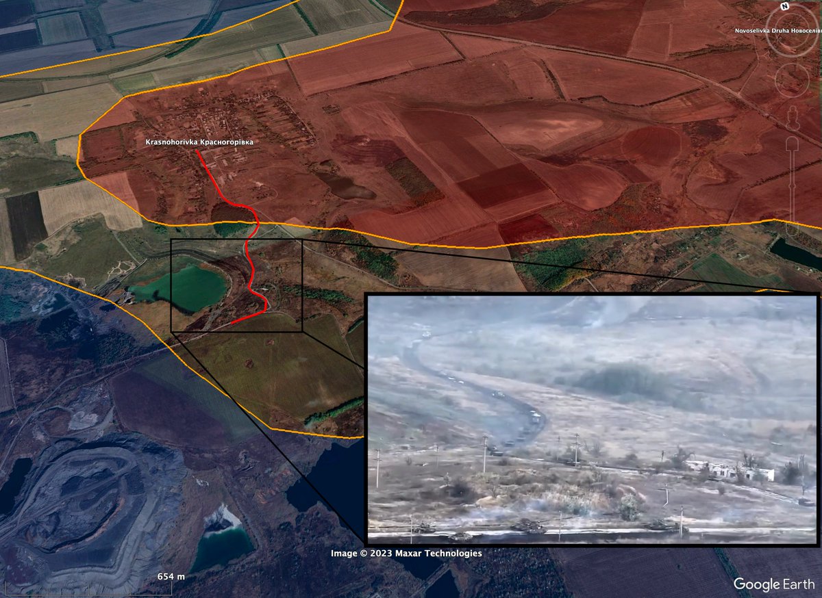 Despite early success of the Russian attackers primarily around Krasnohorivka (Screenshot 1) and thanks to their clandestine built up in this sector, Russian forces showed almost instantly their weaknesses, especially when it comes to mobile warfare. You cannot describe it differently than they utterly suck here. This has been a constant in Russian warfare since February 24, 2022, and it is mind boggling how little they learned ever since. There were several videos showing large convoys of Russian vehicles trying to squeeze themselves through roads which in the end were basically chokepoints. Especially their strike force from Krasnohorivka, which made few hundred meters progress, showed this development (Screenshot 1). You could observe that Russian tanks were trying to bypass the leading vehicles which likely were stopped by mines or Ukrainian ATGM and drone teams, which btw. fought valiantly.