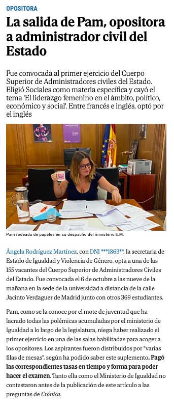 Hoy El Mundo, edición papel, publicaba una noticia afirmando que la secretaria de Estado de Igualdad se había presentado a una oposición. Era, decían, "la primera señal de la disolución del Ministerio de Igualdad que dirige Irene Montero". Ángela Rodríguez se buscaba un futuro.