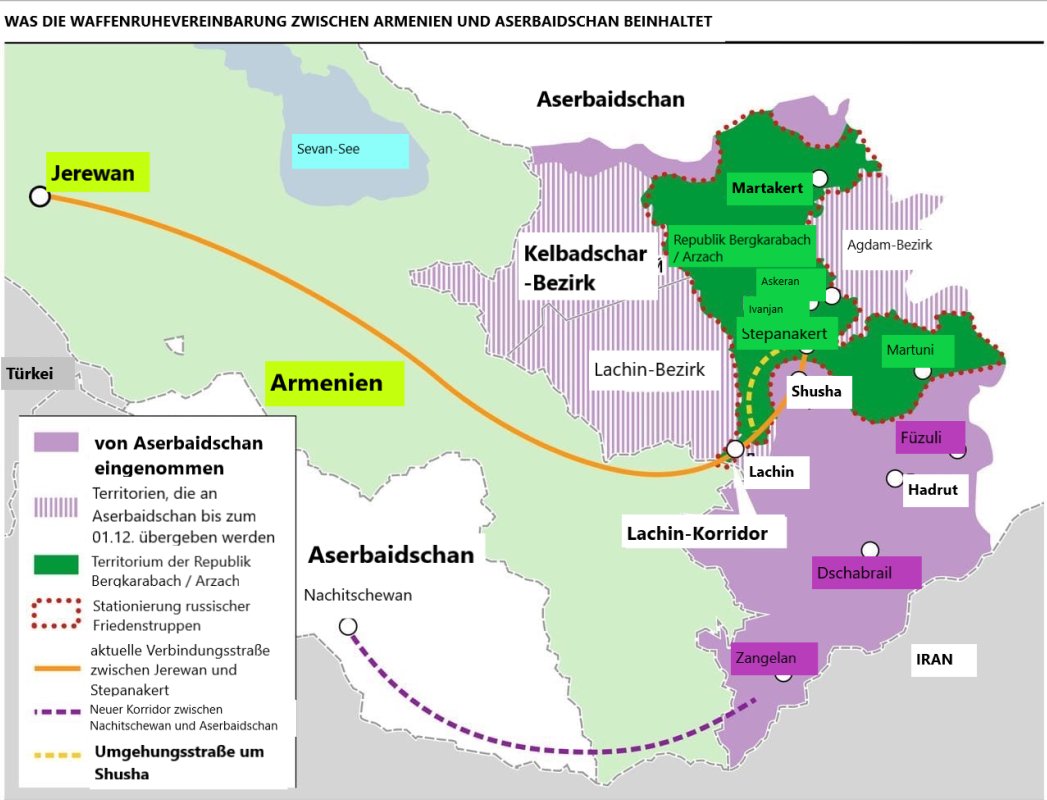 Im Herbst 2020 fand der sogenannte "Zweite Karabachkrieg" statt. Er endete mit einer Waffenruhe, bei der Aserbaidschan viele Gebiete unter Kontrolle nahm