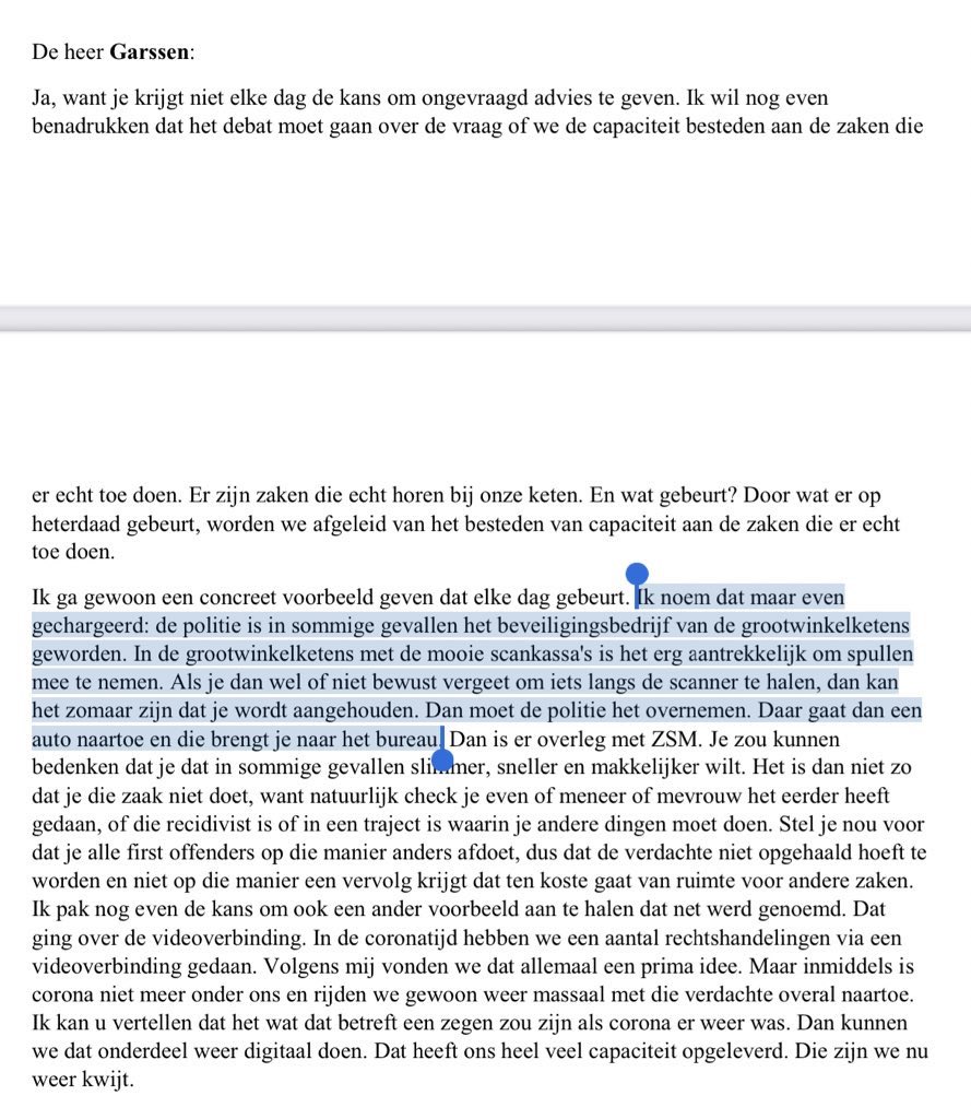 D66 blijft zich inzetten voor meer capaciteit bij politie & rechterlijke macht. En we moeten de schaarse middelen effectiever benutten. Kijk naar winkeldiefstallen: van 30.960 (2021) naar 40.505 (2022) Wat zegt de politie? We lijken de beveiliging vh grootwinkelbedrijf wel. (4/6)